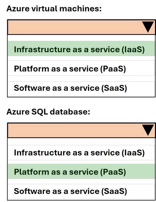 Which cloud deployment is used for Azure virtual machines and Azure SQL database? To answer, select the appropriate options in the answer area.