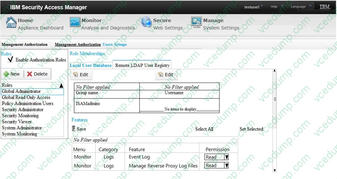 A. SAMLThe deployment professional (testuser1) is currently logged into the appliance, but cannot read the IBM Security Access Manager (ISAM) V9.0 event logs. Management authorization is configured as shown in the following screenshot.