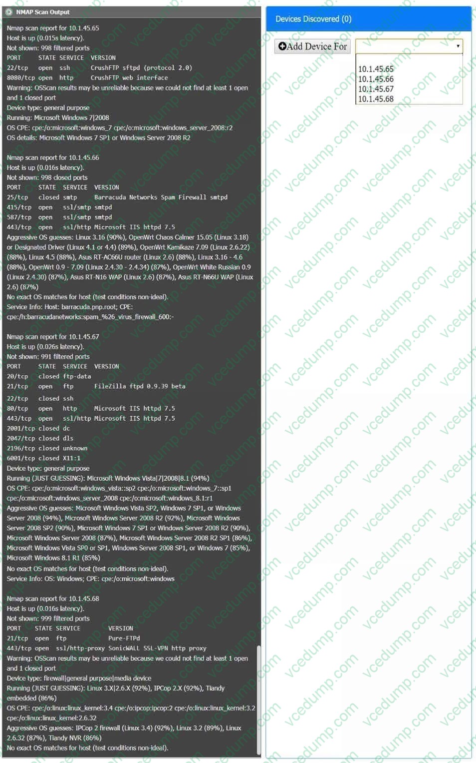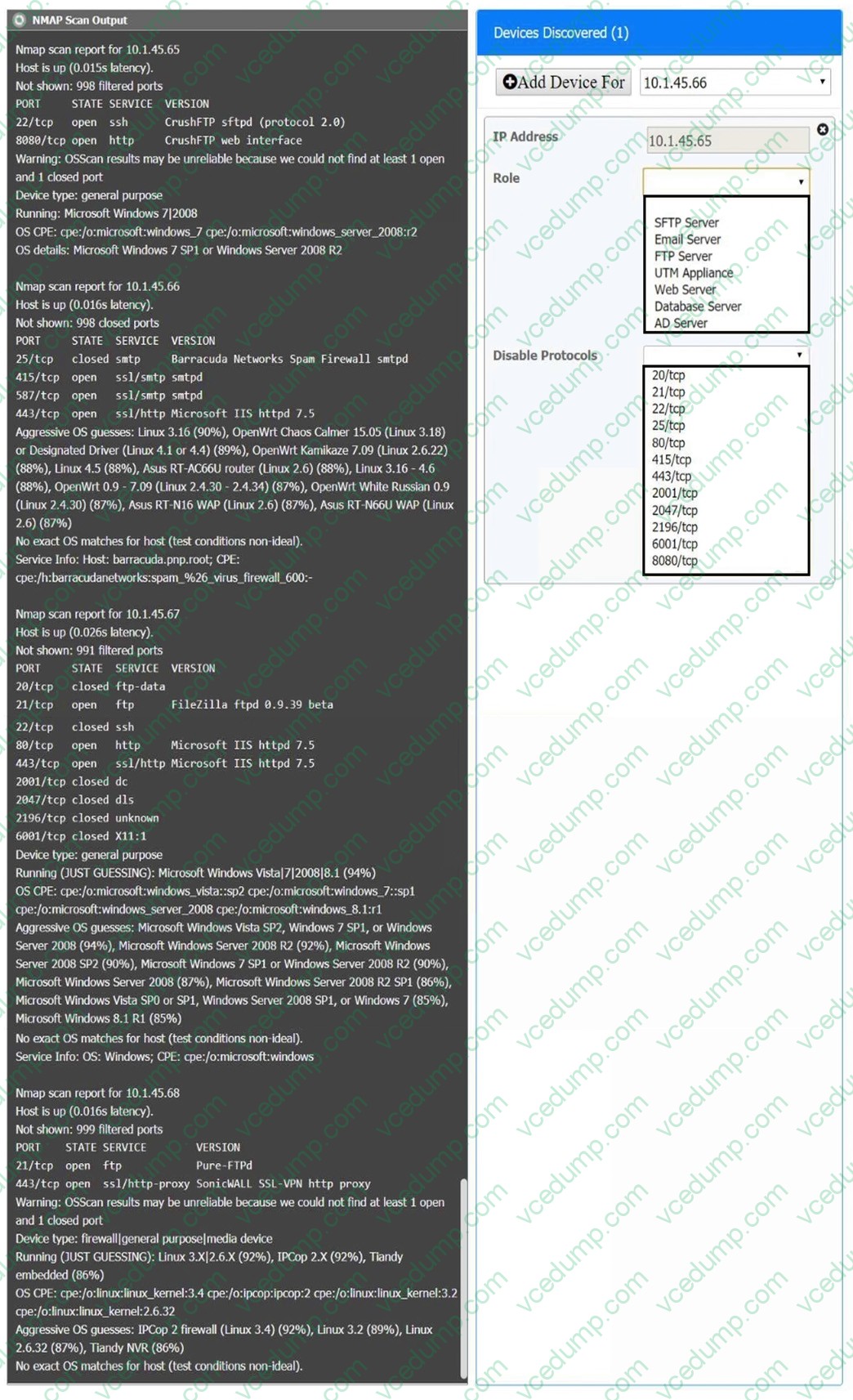 Using the Nmap output, identify the devices on the network and their roles, and any open ports that should be closed. For each device found, add a device entry to the Devices Discovered list, with the following information: