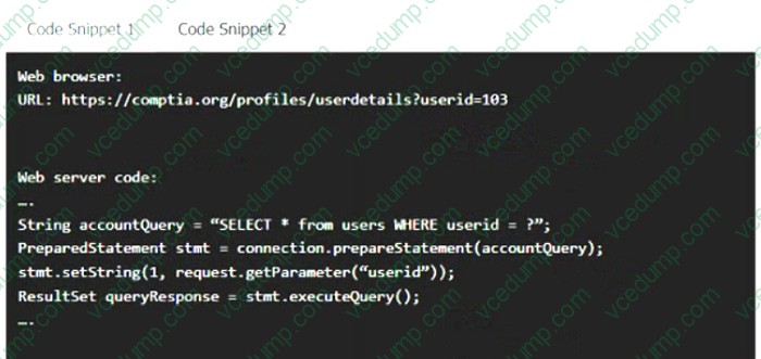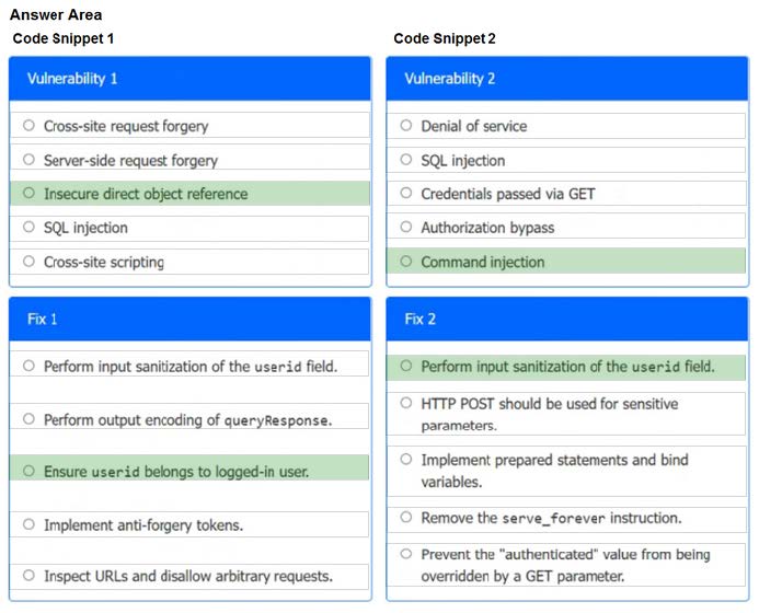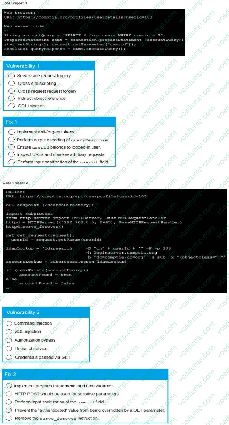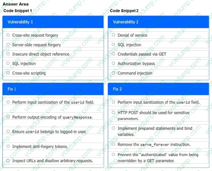 Analyze the code snippets and then select one vulnerability and one fix for each code snippet If at any time you would like to bang back the initial state of the simulation, please click the Reset All button.