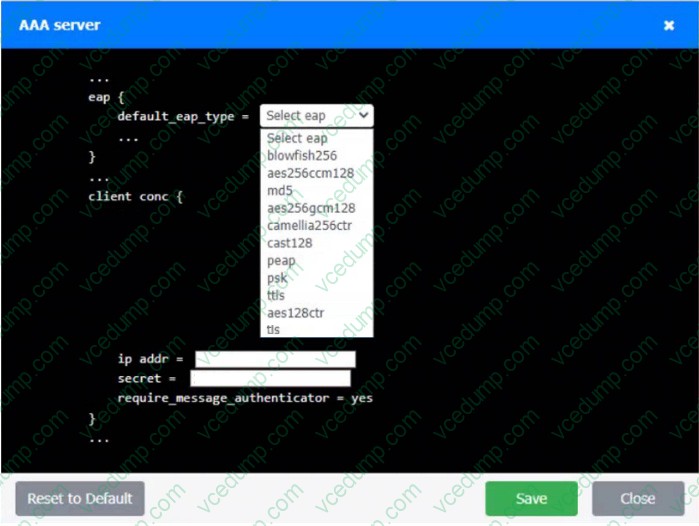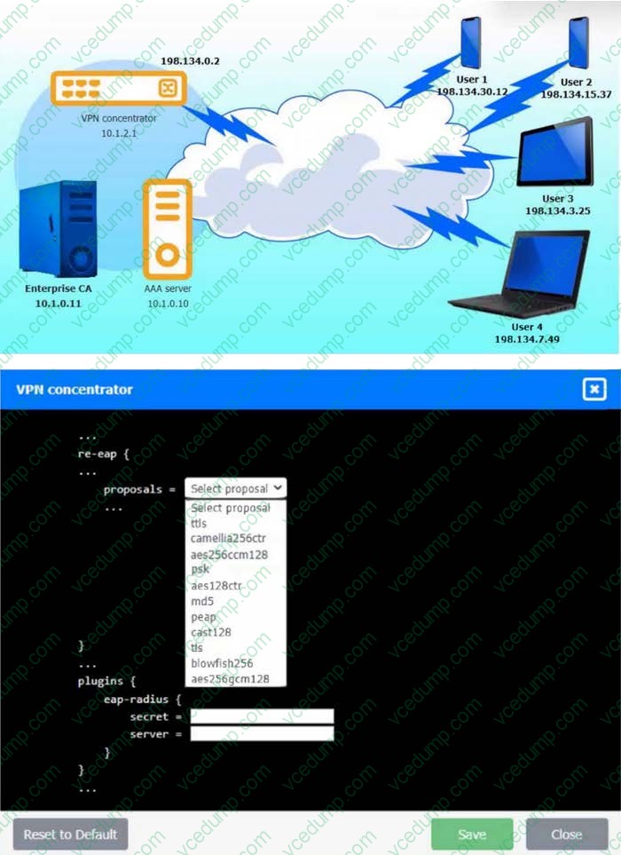 An IPSec solution is being deployed. The configuration files for both the VPN concentrator and the AAA server are shown in the diagram.