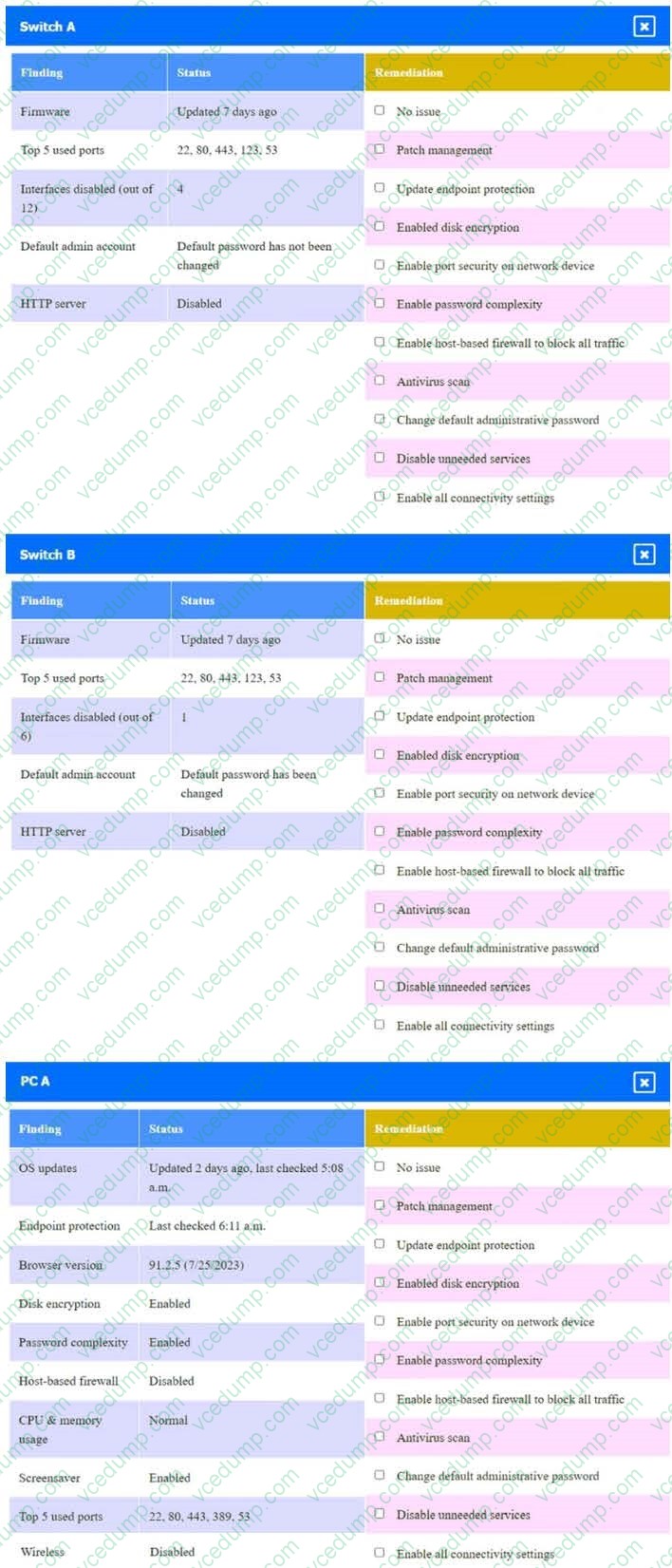 Click on the various workstations and network devices to review the posture assessment results. Remediate any possible issues or indicate that no issue is found.