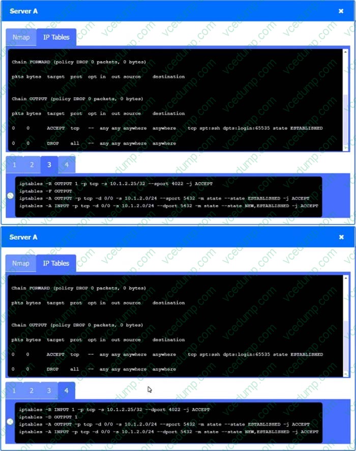 Click on Server A to review output data. Select commands in the appropriate tab to remediate connectivity problems to the PostgreSQL database via SSH.
