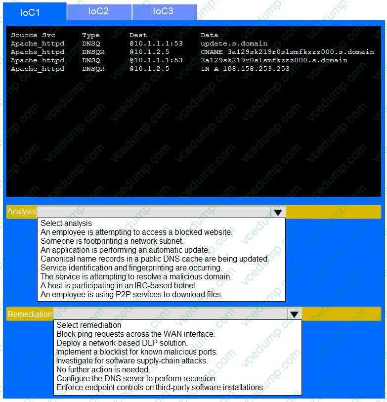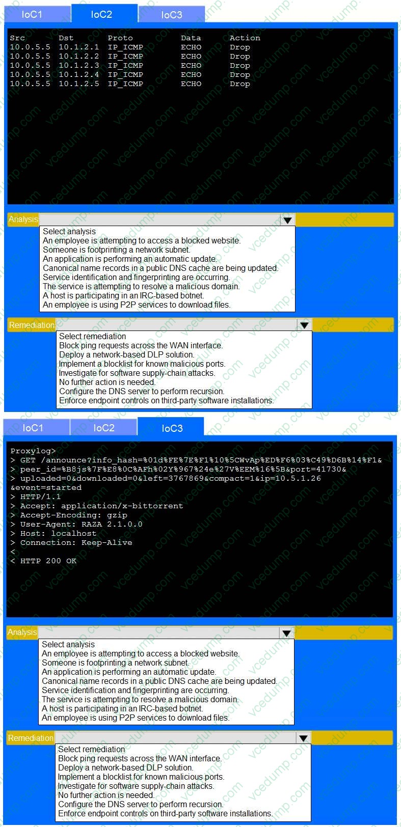 Review each of the events and select the appropriate analysis and remediation options for each IoC.