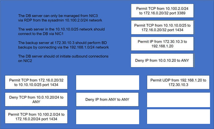 A security administrator must configure the database server shown below the comply with the four requirements listed. Drag and drop the appropriate ACL that should be configured on the database server to its corresponding requirement. Answer options may be used once or not at all.