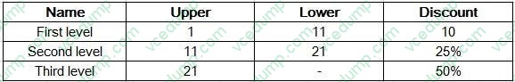 A. Subscription Pricing: Fixed, Percent of Total (%): 15%, Include in Percent of Total: False, Subscription Term: 1Universal Containers has a slab Discount Schedule for Product A with these Discount Tiers: