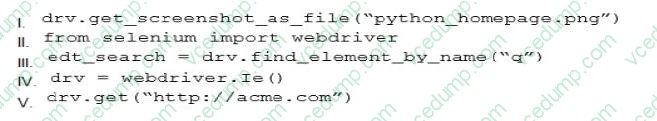 What is the correct sequence of above lines to take a screenshot of ACME.com homepage?