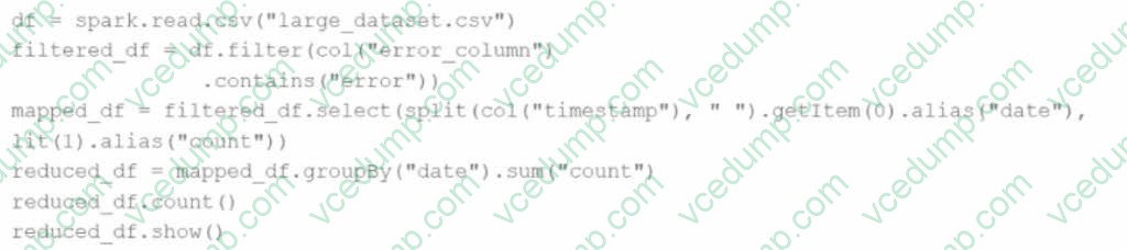 A. When the filter transformation is appliedA developer wants to refactor some older Spark code to leverage built-in functions introduced in Spark 3.5.0. The existing code performs array manipulations manually. Which of the following code snippets utilizes new built-in functions in Spark 3.5.0 for array operations?