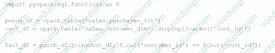 A. fact_df = purch_df.join(cust_df, F.col('customer_id') == F.col('custid'), 'left')Given the code: