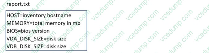 Create a file in/home/sandy/ansible/calledreport.yml.Using this playbook, get a filecalled report.txt(make it look exactly as below). Copy this file over to all remote hosts at /root/report.txt.Then edit the lines in the file to provide the real informationofthehosts. Ifa disk does not exist then write NONE.