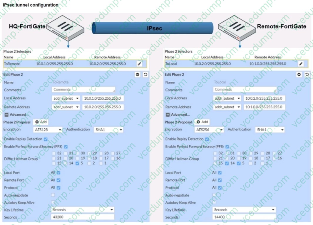 A. On Remote-FortiGate, set Seconds to 43200. B. On HQ-FortiGate, enable Diffie-Hellman Group 2. C. On HQ-FortiGate, set Encryption to AES256. D. On Remote-FortiGate, set Remote Address to 10.0.1.0/255.255.255.0.