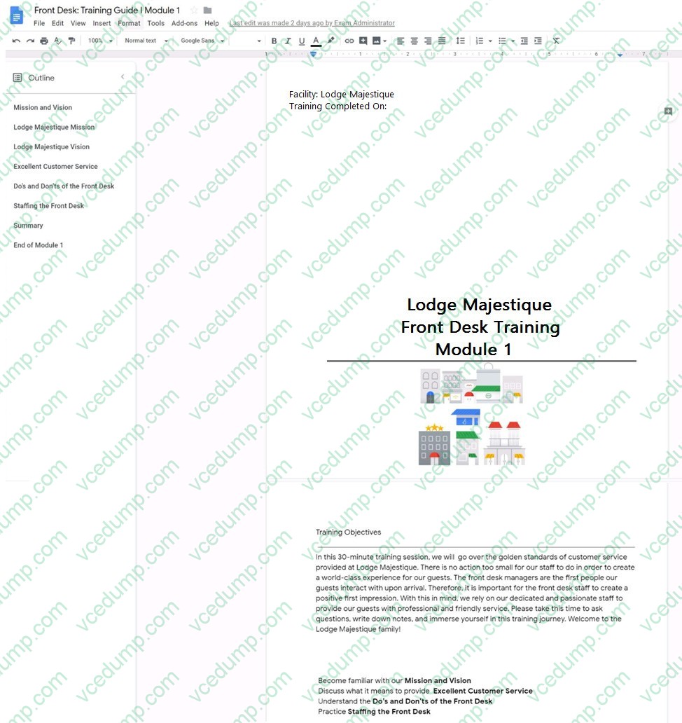 SIMULATION Overview In the following tasks, you will demonstrate your ability to work in Google Docs. Lodge Majestique is a prominent vacation destination known for its great customer service. You will be finalizing a training guide for the Lodge Majestique Front