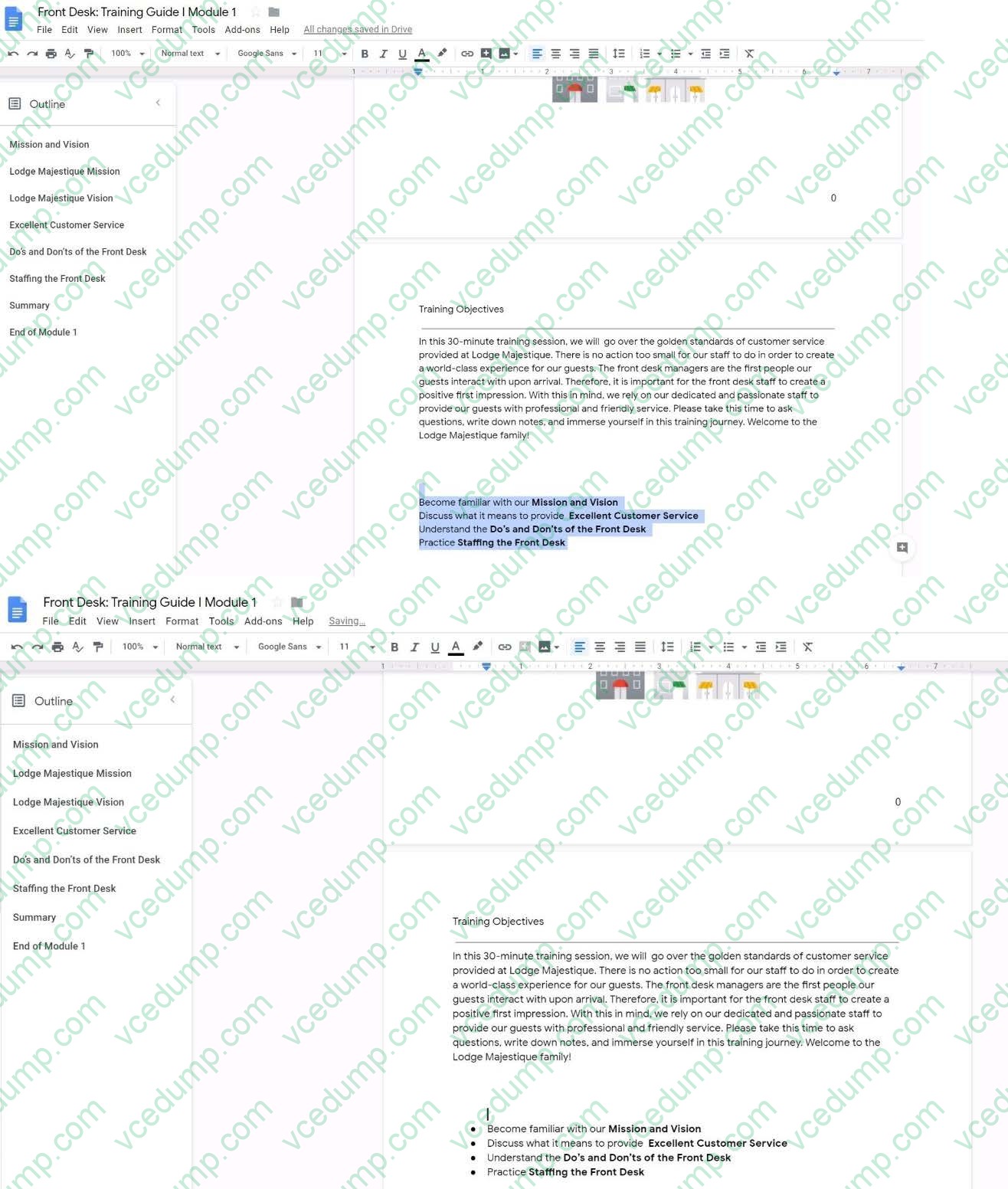 In the following tasks, you will demonstrate your ability to work in Google Docs. Lodge Majestique is a prominent vacation destination known for its great customer service. You will be finalizing a training guide for the Lodge Majestique Front Desk. Use the Front Desk: Training Guide | Module 1 for all the tasks in this scenario.