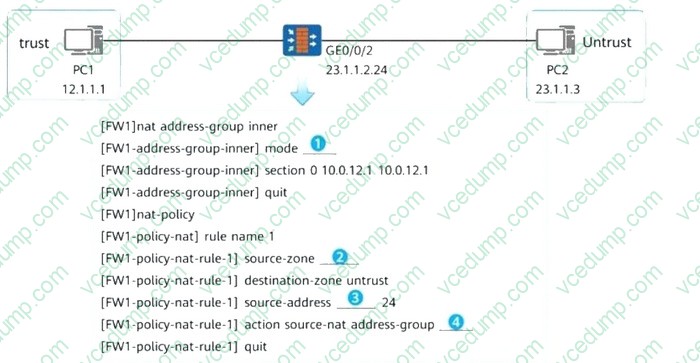 To enable PC1 to access PC2 using the IP address of the firewall's GE0/0/2, you need to configure NAPT for source address translation. In the following figure, fill in the blank to complete the command.