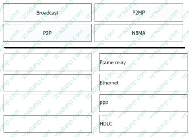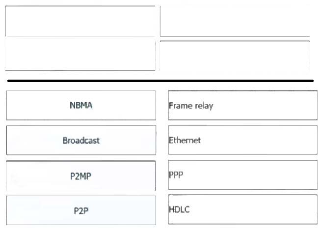 OSPF networks are classified into four types of networks by link layer protocol. Drag the following link layer protocols to the corresponding network types.(Token is reusable)