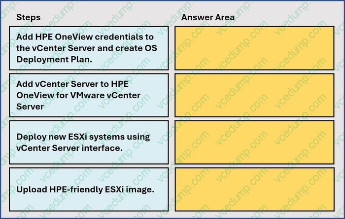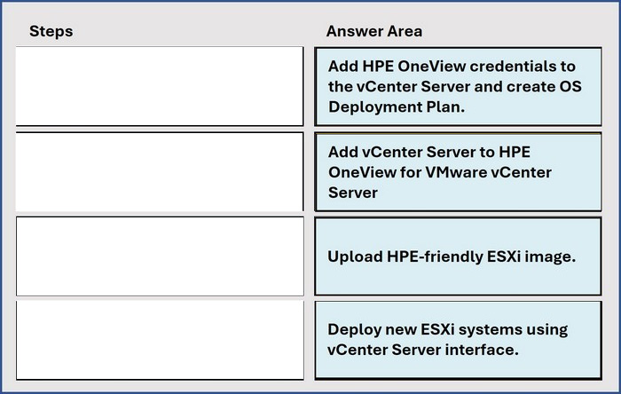 Put the steps required to configure HPE OneView for VMware vCenter Server on the left into their correct order on the right.