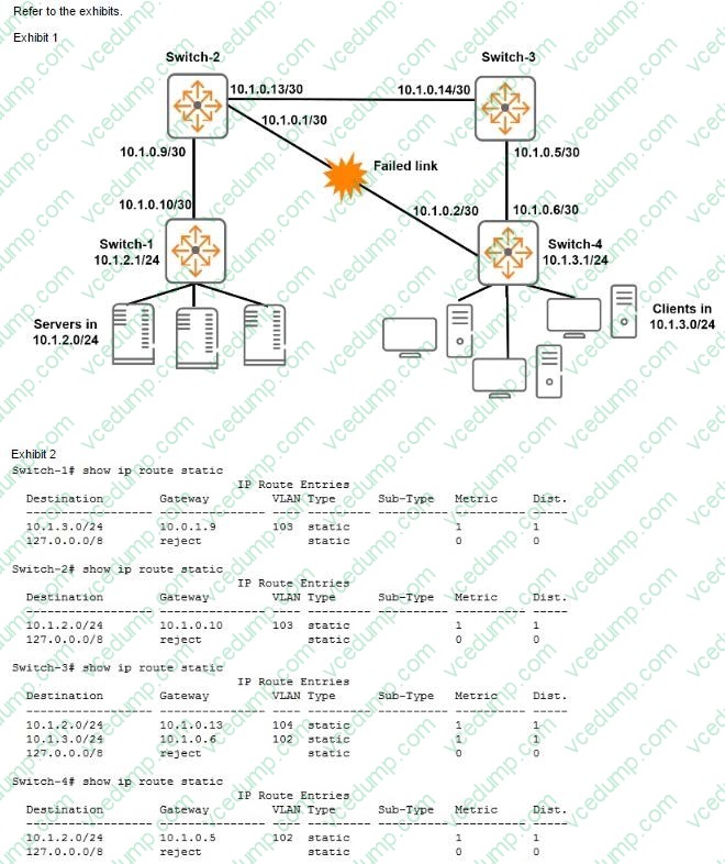 Exhibit 2 shows the IP routine tables for all the switches after the link between Switch-4 and Switch-2 failed '//'hen This link fails traffic between 10 1 3 0/24 and 10.1.2.0724 is disrupted What should the network administrator do to ensure that this traffic continues to flow if this link fails in the future? (Assume that routes on Switch-1 and Switch-3 are correct.)