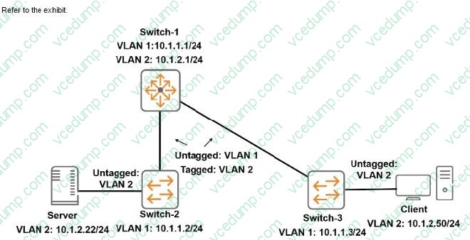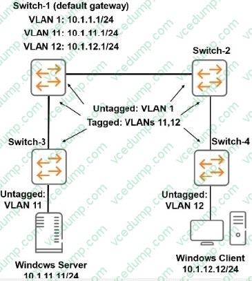 The ArubaOS switches were at default settings. The network administrator configures the VLANs and IP addresses as shown in the exhibit. All inter switch links are untagged for VLAN 1 and tagged for VLANs 11 and 12. There is no additional configuration performed on the switches. The Windows Server and Windows Client are configured to use Switch-1 as their default gateway.