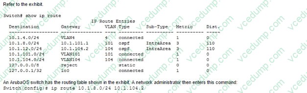 A. It forwards all of the traffic to 10.1.101.1.A port on an ArubaOS switch has its default spanning tree settings. When is the port defined as a spanning tree edge port?