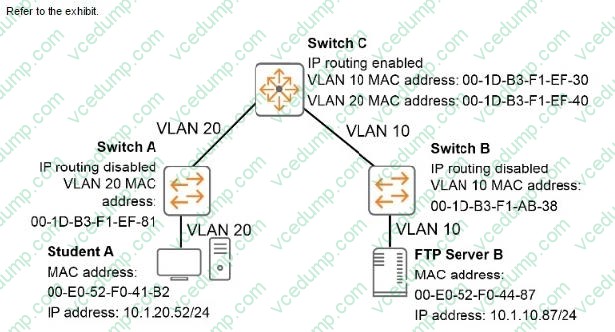 The Student A client needs to connect to FTP Server B. Student A sends the necessary ARP request and receives a reply. Which destination MAC address does the Student A client use in the FTP packet to FTP Server B?