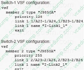 Switch-1 and Switch-2 have the Virtual Switching Framework (VSF) settings shown in the exhibits. The administrator then connects the switches together on the interfaces in the VSF link. The administrator first enables VSF on Switch-I and