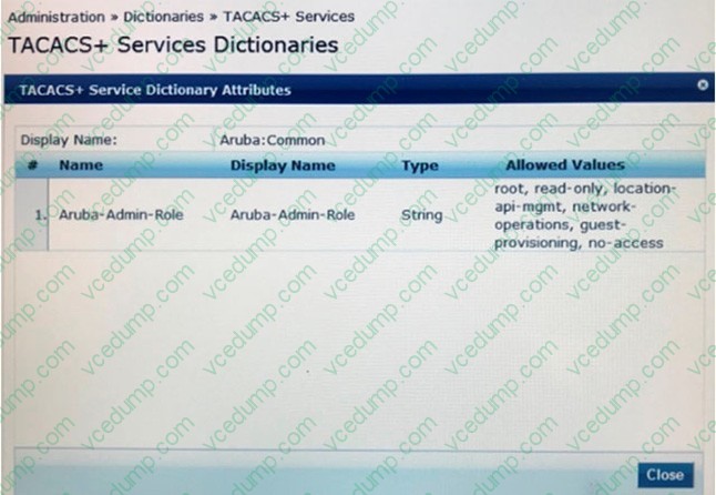 Based on the Aruba TACACS+ dictionary shown, how is the Aruba-Role attribute used?