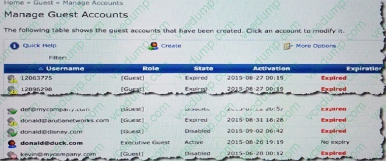 An administrator logs in to the Guest module in ClearPass and `Manage Accounts' displays as shown.
