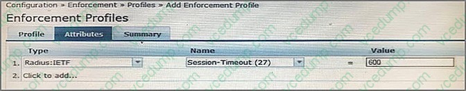 A. It will send the Session-Timeout attribute in the RADIUS Access-Request packet to the NAD and the NAD will end the user's session after 600 seconds. B. It will send the Session-Timeout attribute in the RADIUS Access-Accept packet to the User and the user's session will be terminated after 600 seconds. C. It will count down 600 seconds and send a RADUIS CoA message to the NAD to end the user's session after this time is up. D. It will count down 600 seconds and send a RADUIUS CoA message to the user to end the user's session after this time is up. E. It will send the session -Timeout attribute in the RADIUS Access-Accept packet to the NAD and the NAD will end the user's session after 600 seconds.