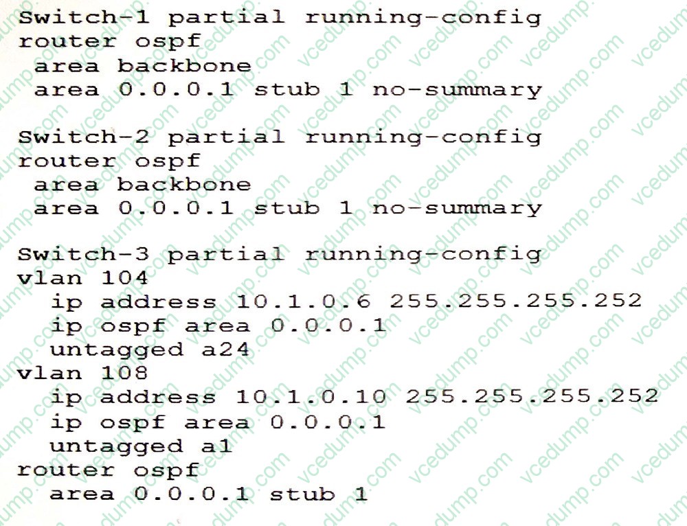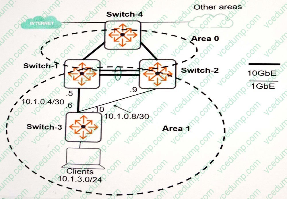 Both Switch-1 and Switch-2 have an OSPF inter-area route to 10.2.0.0/16 with metric 10 in their IP routing table. Switch-3 has the default setting for ECMP. Based on the exhibits, what should the Switch-3 routing table display if the network operates as normal?