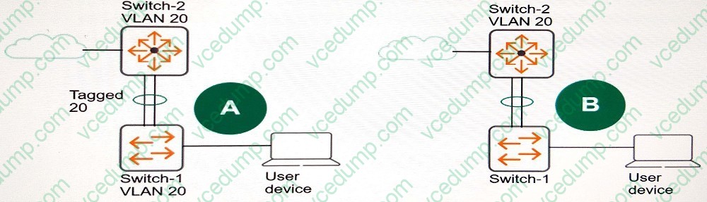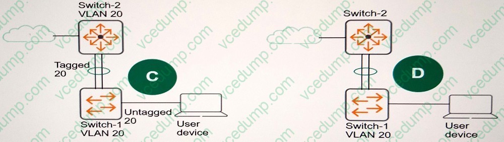 In the exhibits, VLAN 20 under a device name indicates that the device is configured with that VLAN. The exhibits also indicate whether VLAN 20 is statically configured on each link, either as an untagged or a tagged VLAN. If the link has no label, VLAN 20 is not statically configured on that link.