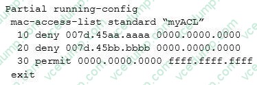 An AOS-Switch has the ACL shown in the exhibit. A network administrator then enters these commands: Switch(config)# mac-access-list standard myACL Switch(config-std-macl)# 25 deny 007d.45cc.0000 0000.0000.ffff