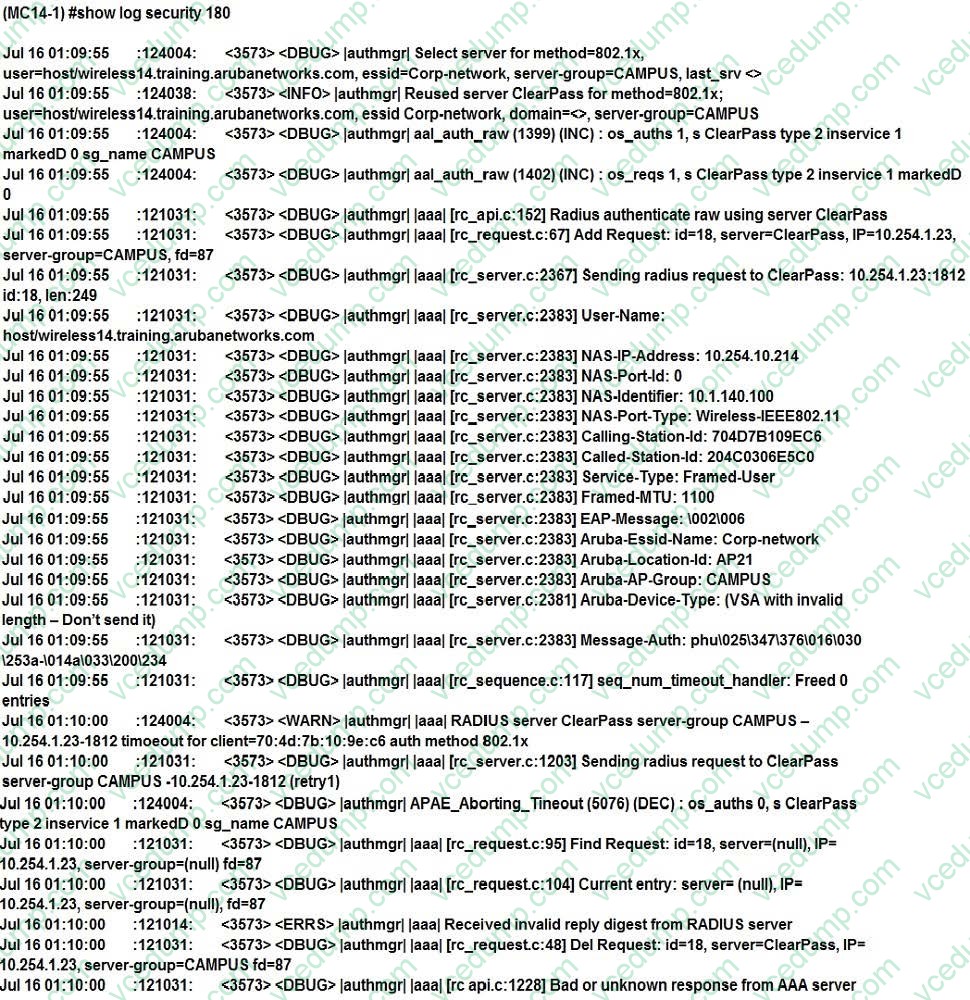 A network administrator deploys a new WLAN named Corp-Network. The security suite is WPA2 with 802.1X. A new ClearPass server is used as the authentication server. Connection attempts to this WLAN are rejected, and no trace of the attempt is seen in the ClearPass Policy Manager Access Tracker. However, the network administrator is able to see the logs shown in the exhibit.