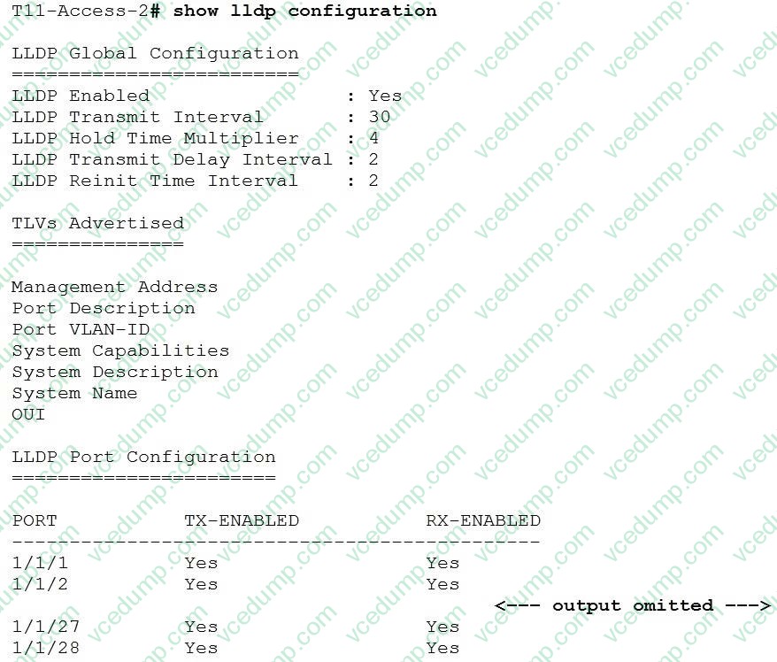 A. none; LLDP is enabled by default on Aruba switchesCore#configure terminal Core(config)#vrf Green Core(config-vrf)#exit Core(config)# Core(config)#interface vlan 50 Core(config-if-vlan)#?