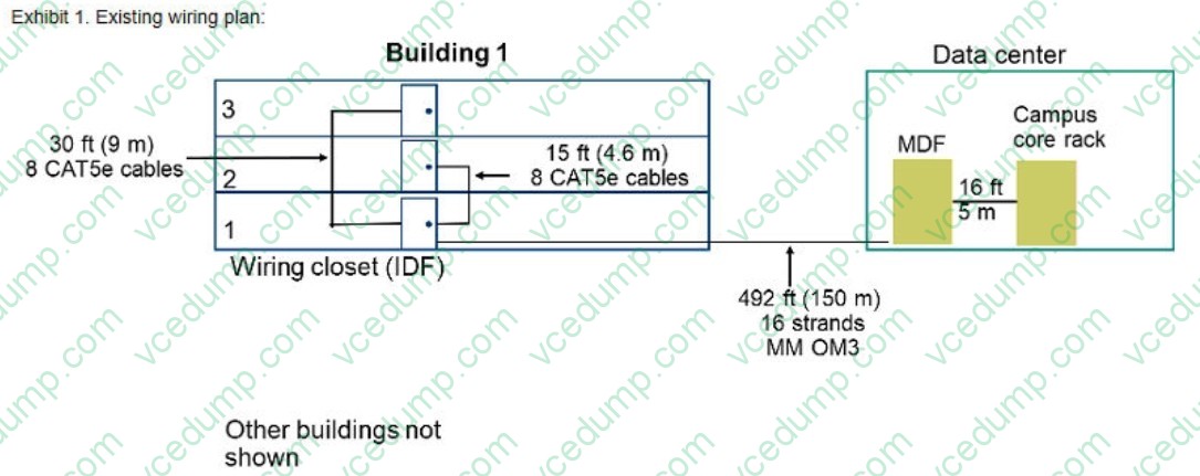 A customer has a building that needs a switch upgrade. The customer would like at least 20Gbps for the uplink bandwidth out of each closet. The building wiring plan is shown in Exhibit i. The customer will not consider any cabling upgrades at this point. The current proposal is shown in Exhibit 2.