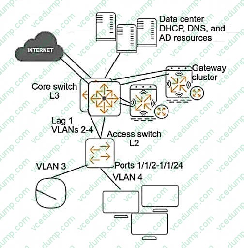-- Clients are denied access to 10.1.0.0/16 The switch topology is shown here: