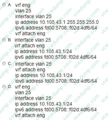 VLANID = 25 IPv4 address 10 105 43 1 with mask 255 255 255.0 IPv6 address fd00:5708::f02d:4df6 with a 64 bit prefix length member of VRF eng VRF eng and VLAN 25 have not yet been created