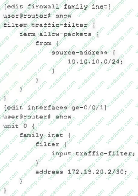 A. All traffic to destination 10.10.10.0/24 is accepted. B. All traffic entering on interface ge-0/0/1 is discarded. C. All traffic entering on interface ge-0/0/1 is accepted. D. All traffic from source 10.10.10.0/24 is accepted.