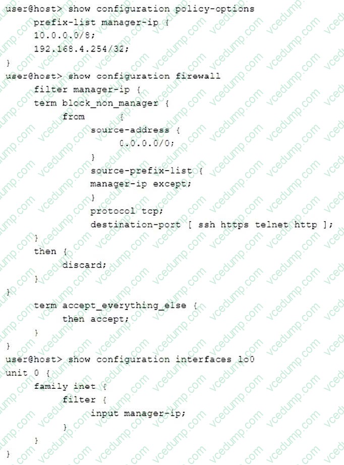 You are validating the configuration template for device access. The commands in the exhibit have been entered to secure IP access to an SRX Series device.