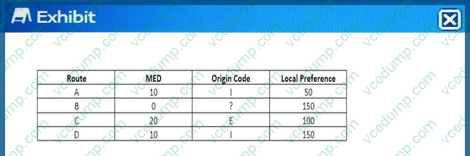 A routing table contains multiple BGP routes to the same destination prefix. The route preference is the same for each route. Referring to the exhibit, which route would be selected?