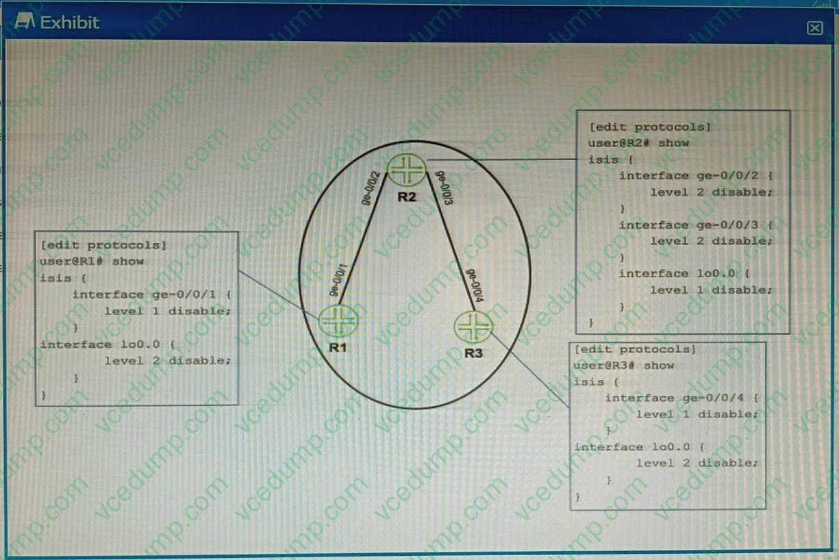 Exhibit Referring to the exhibit, which two configuration changes must you apply for packets to reach from R1 to R3 using IS-IS? (Choose two.)