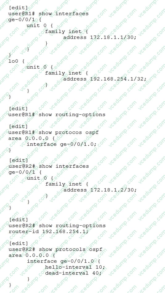 You configured R1 and R2 to form an OSPF adjacency, but the adjacency will not establish. Referring to the exhibit, which statement correctly identifies the problem?