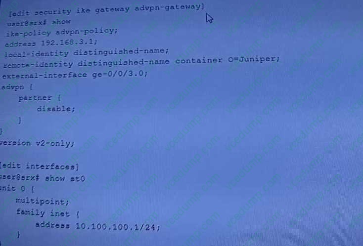 B. [edit security ike gateway advpn-gateway] user@srx# delete advpn partner D. [edit security ike gateway advpn-gateway] user@srx# set advpn suggester disable explanation: