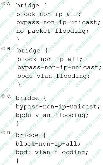 You are configuring transparent mode on an SRX Series device. You must permit IP-based traffic only, and BPDUs must be restricted to the VLANs from which they originate.