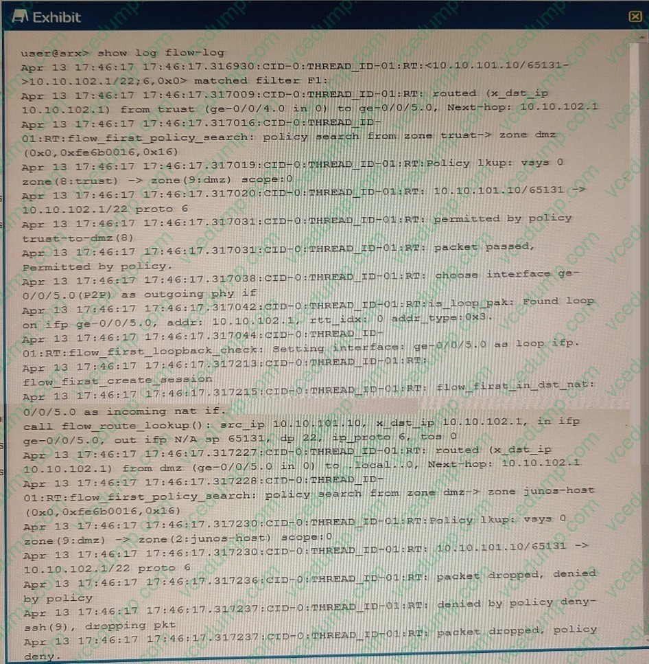 A. The packet's destination is to an interface on the SRX Series device. B. The packet's destination is to a server in the DMZ zone. C. The packet originated within the Trust zone. D. The packet is dropped before making an SSH connection. E. The packet is allowed to make an SSH connection.