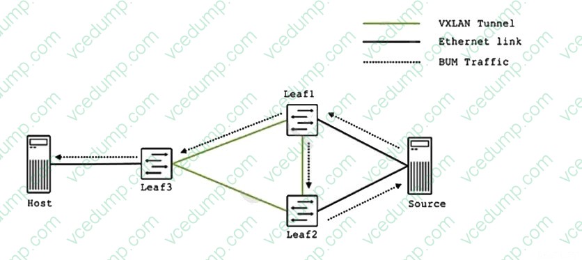 A. Verify that the same ESI is configured on the link from thehost and that it matches the source. B. Issue the show route table bgp.evpn.0 command on Leaf2 and verify that Type 4 routes are present. C. Issue the show route table bgp.evpn.0 command on Leaf2 and verify that Type 3 routes are present. D. Verify thatthe same ESI is configured on the two links from the source.