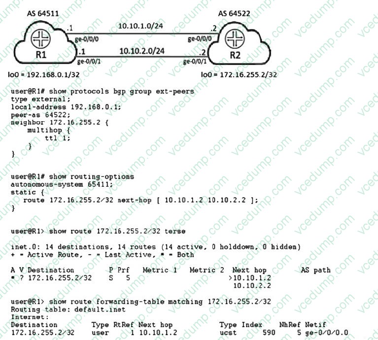 A. Both the next hops will be used to forward traffic to R2. B. A routing policy will be required to forward traffic to both next hops. C. The TTL value of 1 is set to limit the scope of the EBGP session. D. The ttl statement must be configuredto accommodate peering to a loopback address of a directly connected peer.
