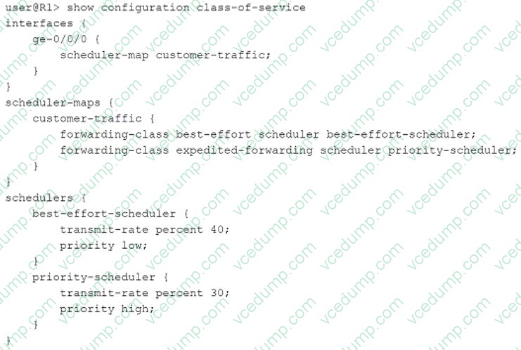 A. Incoming traffic will be classified using the default classifier. D. The best-effort queue can transmit more than 40% of the total bandwidth on the ge-0/0/0 interface, if no other queue is using that bandwidth. explanation: