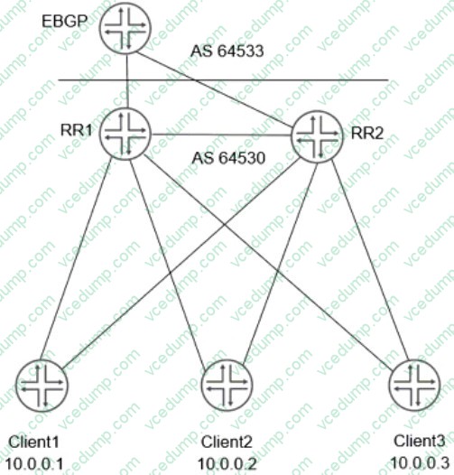 B. RR1 and RR2 append the duster ID when advertising routes from dient to dient. C. RR1 and RR2 advertise routes learned from the clients to EBGP peers, using itself as the next hop. explanation: