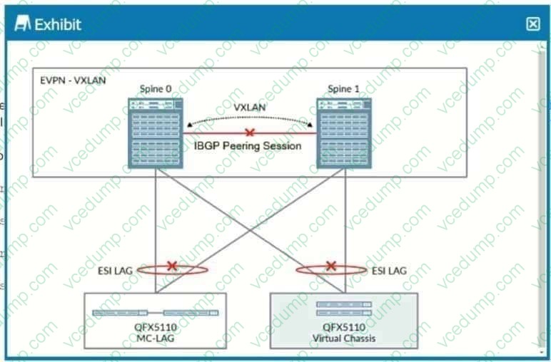 you have a data center in which only the spine devices are using EVPN and VXLAN. The leaf nodes are multihomed in active-active mode to the spine nodes through ESI LAG interfaces. In this design, a link failure on the interface connecting the spine nodes would also cause all traffic from the spine to the leaf nodes to drop.