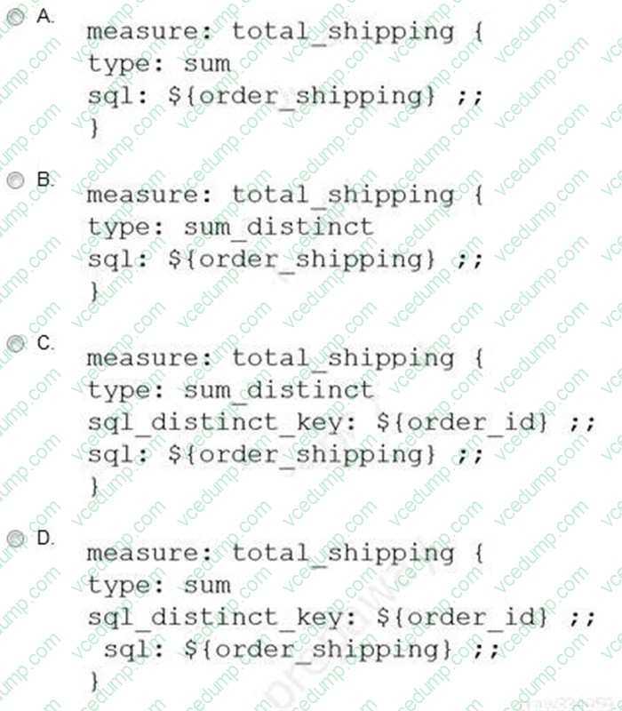 A. A change has been deployed to a shared branch.A LookML Developer is working with denormalized tables and needs to create a measure adding up the Order Shipping column in the table below: